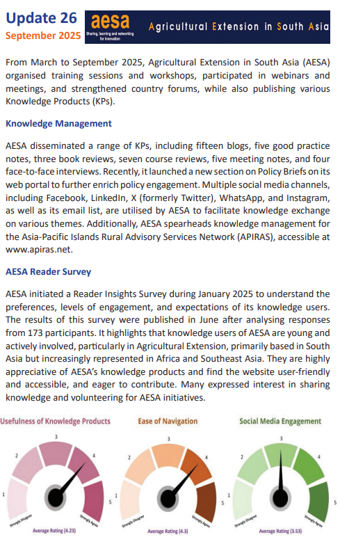 From March to September 2025, Agricultural Extension in South Asia (AESA) organised training sessions and workshops, participated in webinars and meetings, and strengthened country forums, while also publishing various Knowledge Products (KPs).