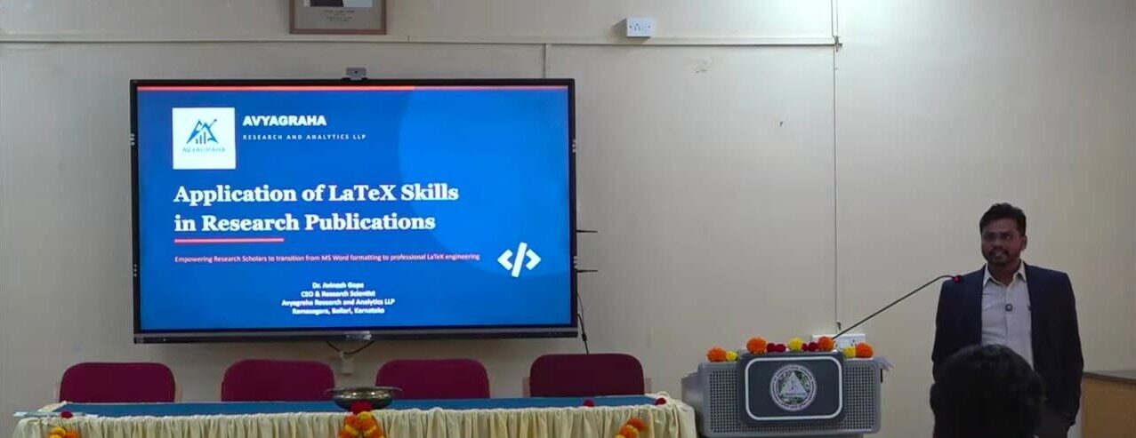 The workshop was led by distinguished resource persons, including Prof. Syed Muzamil Basha and Prof. D. R. Kumar Raja, faculty members from REVA University, Bengaluru, and Dr Avinash Gopa, CEO of Avyagraha Research & Analytics LLP. The resource persons had carefully designed workshop modules that guided us through the various stages of LaTeX-based scientific writing and provided hands-on assistance throughout the sessions. Instead of merely explaining the theoretical aspects of LaTeX, the resource persons focused on helping participants actively practice writing and formatting documents during the sessions. Participating in this workshop was a valuable opportunity for me to explore how modern tools can improve research documentation and scientific communication.