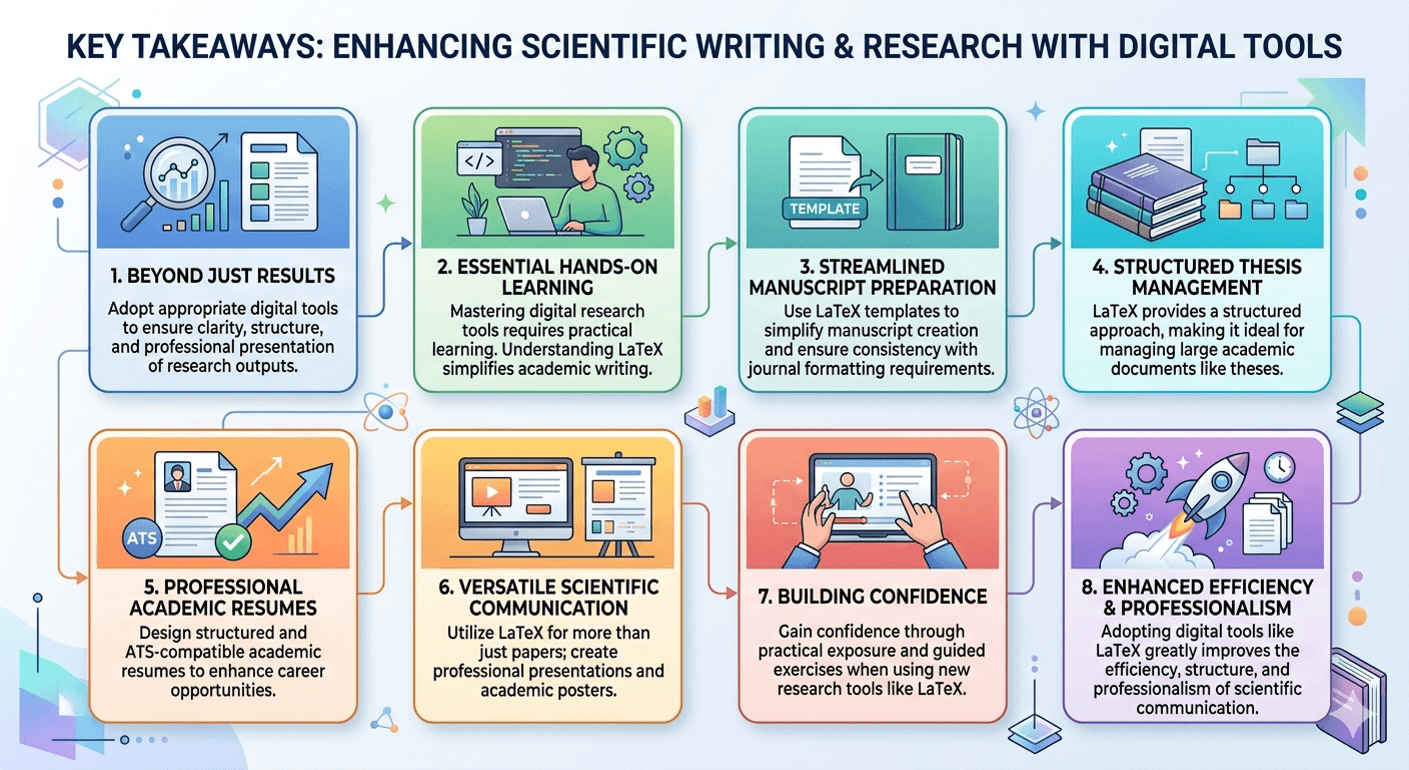Summary of key takeaways from the LaTeX-based scientific writing workshop (This image is AI-generated for illustrative purposes).