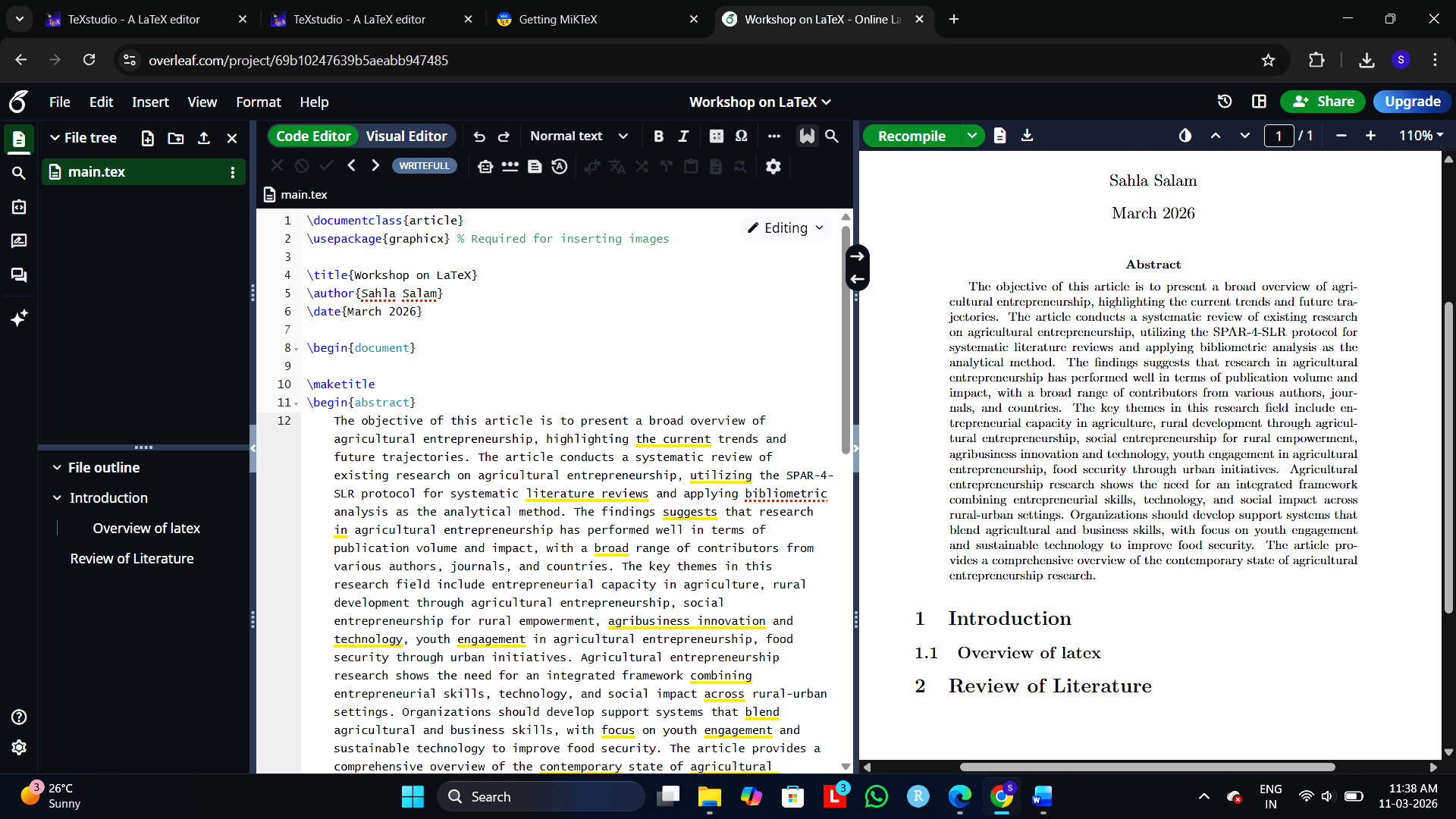 During the sessions, I was introduced to commonly used LaTeX editors such as Overleaf and TeXstudio, which are widely used for creating and compiling LaTeX documents. Through guided exercises, we practised creating basic documents, organising sections and compiling outputs. Initially, I felt that LaTeX might be difficult to learn because it involves writing commands rather than directly formatting text as we do in traditional word processors. However, as the session progressed, I realised that once the logical structure of LaTeX documents is understood, the system becomes highly intuitive and efficient.