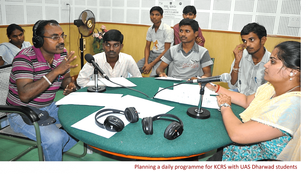 Box 2. Successfully broadcasted KCRS programmes ‘Varada Bassanna’ is another programme related to animal husbandry and veterinary practices. The veterinary doctors at the university develop and present information in colloquial language and style, creating characters, and having conversations and discussions. The programme is aired for 15 minutes in the morning and repeated in the evening from Monday to Saturday. It is very popular among listeners, and almost sixty percent of dairy farmers in the coverage area listen to it. It has won accolades as the best skilling story in the community from the Commonwealth Educational Media Centre for Asia (CEMCA) and the national Skill Development Corporation. ‘Planet Earth’, a Department of Science and Technology-sponsored project, produced and broadcasted a series of programmes about climate change and its impact on crops, pollution, environmental problems, and climate-related uncertainties. It also had discussions on humans and animals, quality of soil ecosystem, protection of natural resources, as well as environmental and health programmes for women. This programme was broadcast for one year, with 20-minute episodes in the morning and evening on all days of the week. The programme officer selected topics in consultation with experts in a particular field, and the topics were allotted to the scientists available in the university as well as other resource persons. The women’s programme showed significant knowledge improvement among women listeners on various topics broadcasted under this programme (Gouri Yellavattimath et al. 2014). |